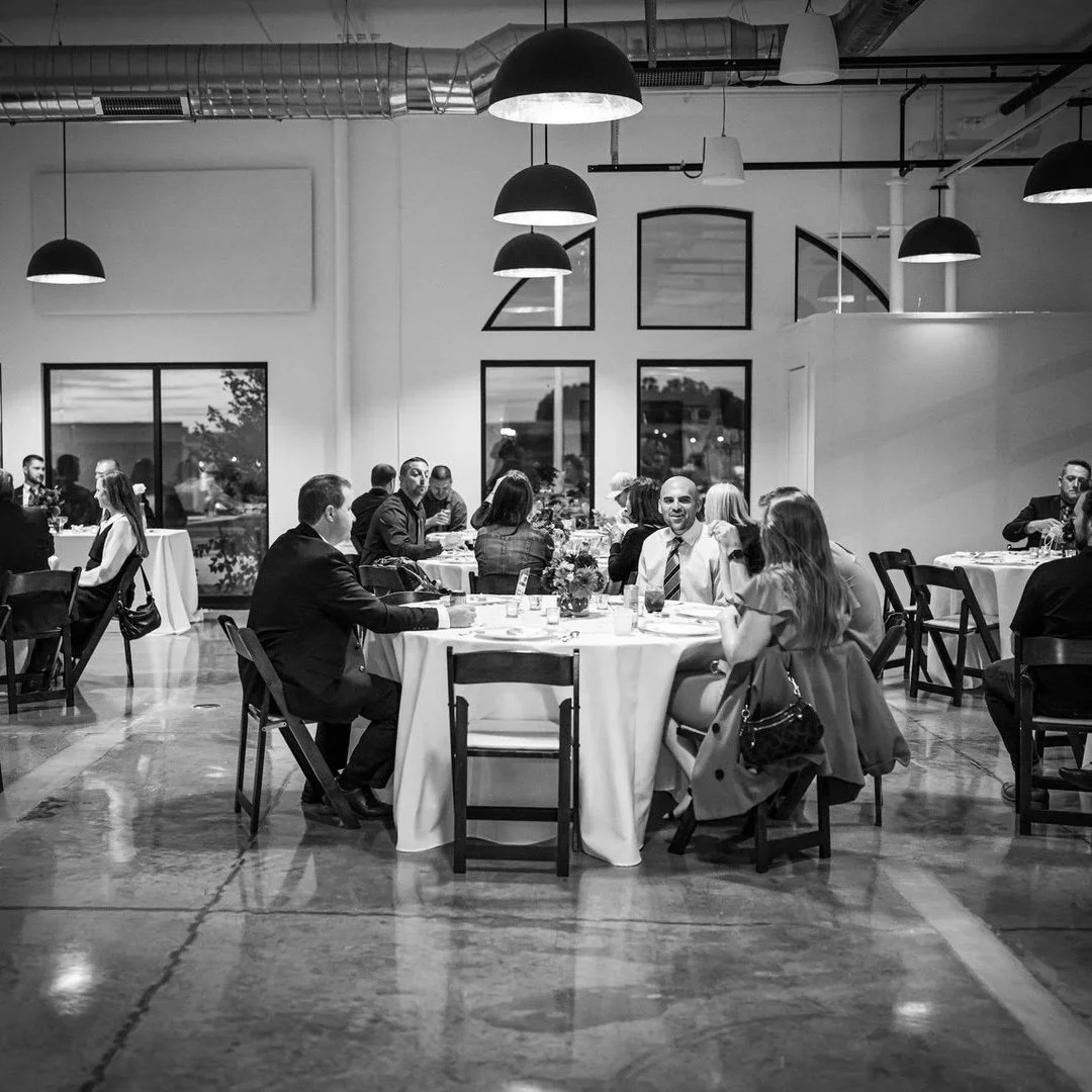 An urban chic venue boasting a main hall with brick walls, oversized windows, exquisite dressing suites, a captivating cocktail lounge, and a spacious patio capable of hosting large outdoor ceremonies.